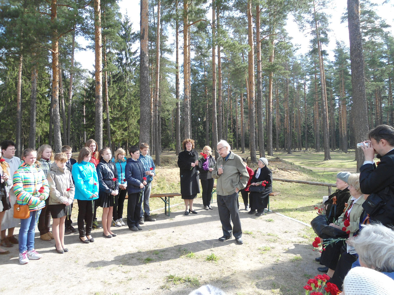 Ветеран 67-й армии Белов Юрий Григорьевич, который 17-ти летним мальчишкой ушёл в Ленинградское народное ополчение рассказал о суровых днях обороны и прорыва блокады города. Он пожелал молодому поколению мирного неба. Юрий Григорьевич обладает исключительной памятью. На месте он показал, где размещались землянки работников штаба, других подразделений армии.